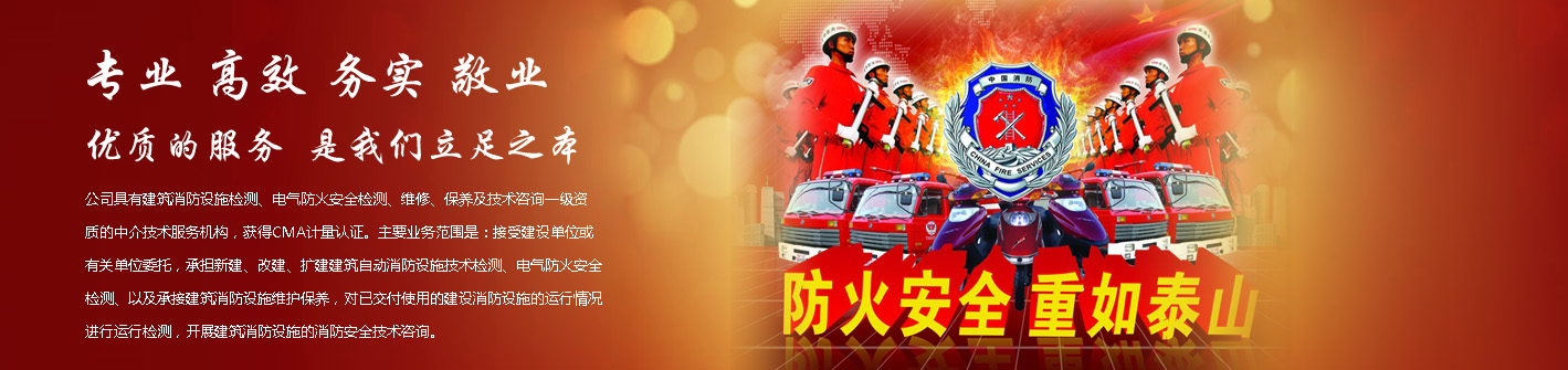 公司具有建筑消防設(shè)施檢測、電氣防火安全檢測、維修、保養(yǎng)及技術(shù)咨詢一級資質(zhì)的中介技術(shù)服務(wù)機(jī)構(gòu),獲得CMA計量認(rèn)證。主要業(yè)務(wù)范圍是:接受建設(shè)單位或有關(guān)單位委托,承擔(dān)新建、改建、擴(kuò)建建筑自動消防設(shè)施技術(shù)檢測、電氣防火安全檢測、以及承接建筑消防設(shè)施維護(hù)保養(yǎng),對已交付使用的建設(shè)消防設(shè)施的運(yùn)行情況進(jìn)行運(yùn)行檢測,開展建筑消防設(shè)施的消防安全技術(shù)咨詢。公司設(shè)辦公室、總工辦、財務(wù)部、檢測部、維保部等職能機(jī)構(gòu),擁有一